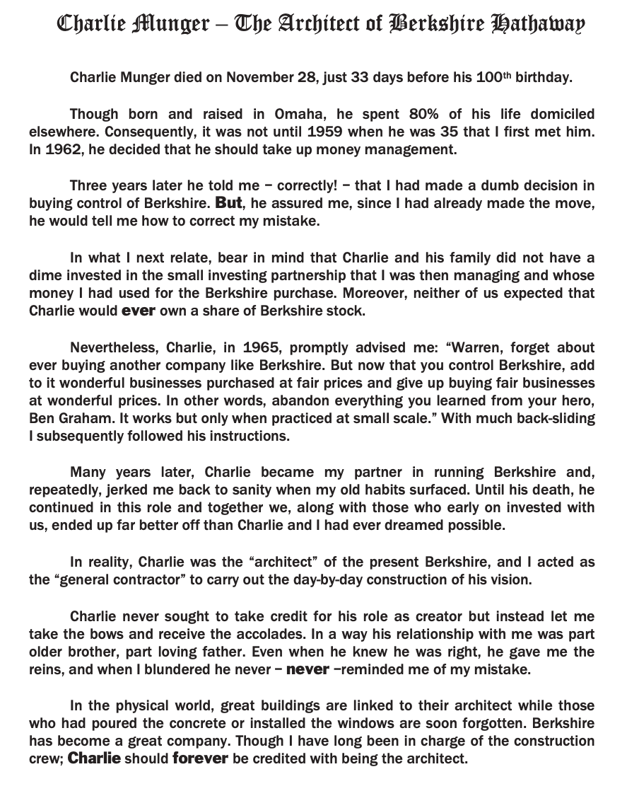 One of the pivotal chapters in Warren Buffett's storied career is his partnership with Charlie Munger, which began in the late 1950s. Munger, a fellow investor and attorney, became vice chairman of Berkshire Hathaway and Buffett's closest investment confidant. Their partnership is often hailed as one of the most successful in the history of American business. Munger's influence on Buffett was profound, particularly in transitioning Buffett's investment strategy from purely undervalued assets to investing in high-quality businesses at reasonable prices. Together, they shared a philosophy that emphasized long-term value, ethical business practices, and the importance of corporate governance. This dynamic duo complemented each other's strengths, with Buffett's analytical prowess and Munger's wit and wisdom, creating an unbeatable combination that has significantly shaped Berkshire Hathaway's success and influenced generations of investors. Their annual shareholder meetings, often dubbed the "Woodstock for Capitalists," became legendary for the insights and entertainment they provided, showcasing not just their investment acumen but their unique blend of humor, philosophy, and practical advice. This was a beautiful letter written by Warren about Charlie when he passed.